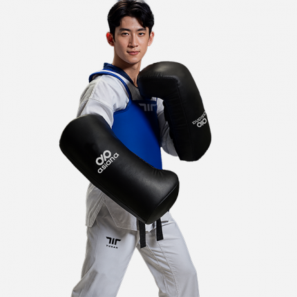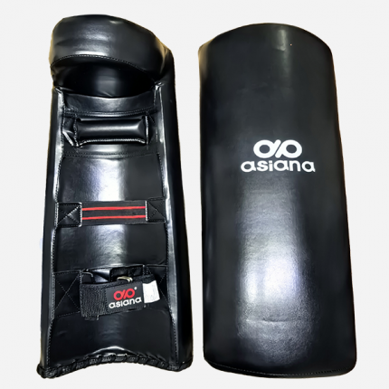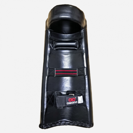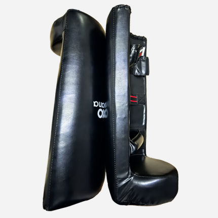 Almaodilla de golpeo tipo escudo curveado para pateo y golpeo con tres puntos de sujeción, fabricado en vinil reforzado con costuras y relleno de EVA.