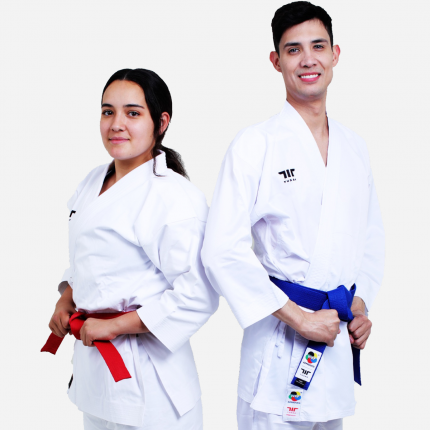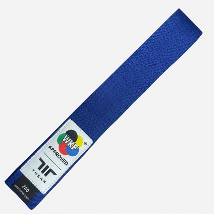 Cinta para Karate aprovada por la World Karate Federation, con costura con doblés en los extremos, fuerte y resistente.